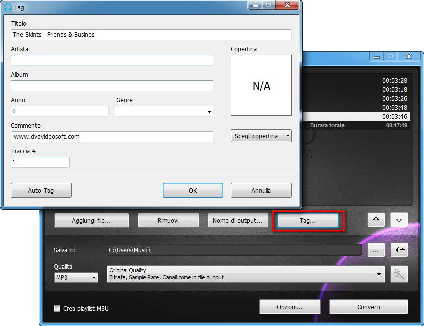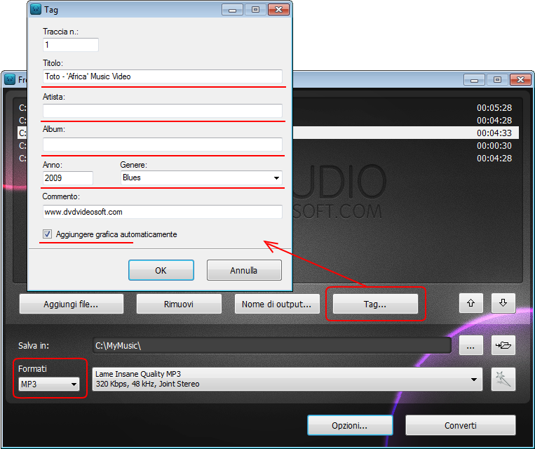 Di sotto è la guida ma vi invito a visitare il sito seguendo i link È infatti un programma gratuito. Non contiene né spyware né adware. È assolutamente sicuro da installarlo ed usarlo. Presentiamo la video guida creata da Elettroaffari. È possibile guardare la video guida o leggere la guida passo a passo che segue. Vai a Start > Tutti i programmi > DVDVideoSoft > i Programmi > Free Audio Converter o clicca sull`icona di DVDVideoSoft Free Studio sul desktop. L`interfaccia è molto semplice e possede delle esplicazioni. Ci sono il campo per i file di input, il campo del percorso di output e la lista delle impostazioni preconfigurate. Se vuoi cambiare il tema (una skin del programma), vai a Opzioni → Tema. Clicca sul pulsante Aggiungi file... e seleziona i file audio di input dal tuo computer. Formati di input sono: *.aac, *.ac3, *.aiff, *.amr, *.ape, *.flac, *.m4a, *.m4b, *.mka, *.mp3, *.ogg, *.ra, *.ram, *.tta, *.wav, *.wma. Per default, il nome di output è lo stesso com'è il titolo del video originale. Se preferisci modificarlo, clicca sul pulsante Nome di output... . Una nuova finestra deve aprirsi. Ci sono qualche parametri (prefisso nome, postfisso nome ed altri) che possono essere configurati a tuo piacere. Nella parte bassa di questa finestra è possibile vedere il modello del nome di output. È il risultato delle opzioni attuali. Nota: il modello è lo stesso per tutti i file di output durante una sessione, non è possibile configurare il modello unico per ogni file. Clicca sul pulsante Sfoglia... e seleziona la cartella in cui vuoi salvare i tuoi file audio convertiti. Clicca su OK. Se vuoi accedere al contenuto della cartella di output, clicca su Aprire. Nella lista dei formati seleziona un formato di output necessario. Dopo scegli una delle impostazioni preconfigurate dalla lista corrispondente alla qualità selezionata. Per gli utenti esperti: è possibile leggere la guida ed apprendere come personalizzare o creare una nuova impostazione. Se vuoi convertire i(l) file nel formato MP3, puoi aggiungere l'informazione sui file audio di output. Clicca sul pulsante Tag... e configura il titolo, l'album, l'artista e gli altri parametri. Per default, il programma riempie automaticamente il tag del titolo e aggiunge la copertina che saranno visibili in iTunes, Winamp o nella cartella Windows Explorer. Clicca su OK per tornare alla finestra principale del programma. Clicca sul pulsante Converti ed attendi finché l'audio sia convertito. Nota: Prima di cliccare sul pulsante Converti è possibile impostare la funzione "Se il processo è stato completato, spegnere il computer". Per farlo clicca su Opzioni... e assicurati che la casella appropriata sia spuntata.